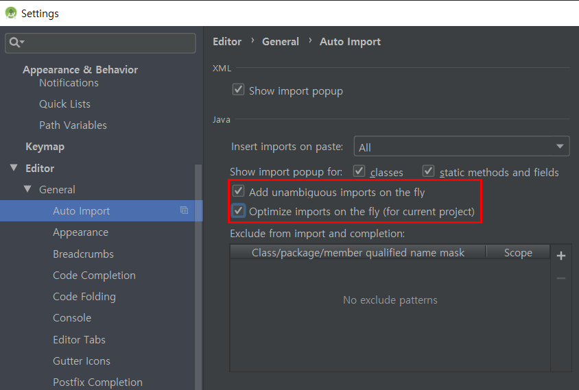 매번 키입력이 어려우므로 설정에서 자동임포트 기능을 체크한다