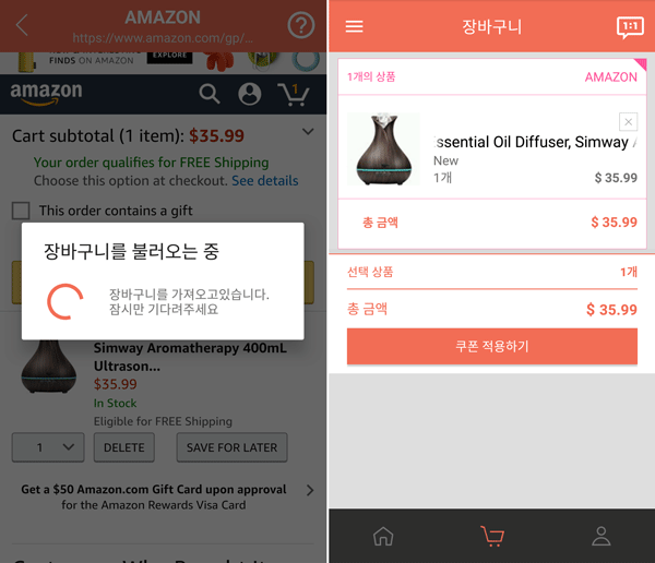 이제 쿠폰 적용하기를 누르는데요, 아쉽게도 아마존에는 쿠폰이 없어서 적용되지 않을 거예요. 하지만 애프터바이에서 폴로랄프로렌, 갭, 카터스 등의 쇼핑몰을 이용하신다면 자동으로 쿠폰이 적용되어 매우 편리하답니다.