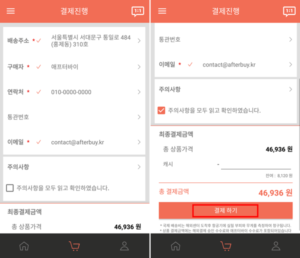 여기서부터는 뭔가 익숙하죠? 국내 쇼핑몰과 다를바가 없이 이름, 연락처, 주소 등을 한글로 적어주시면 됩니다. 주의사항 읽어보시는 것도 잊지 마세요!