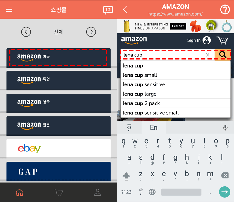 애프터바이에서는 다양한 종류의 쇼핑몰들을 지원합니다. 아마존 레나컵 직구 방법에 대해 설명드릴 예정이므로, 미국 아마존으로 들어가겠습니다. 만약 독일 생리컵 제품을 구매하길 원하신다면 독일 아마존으로 들어가셔서 똑같은 절차를 거쳐주시면 됩니다. 아마존 쇼핑몰에 접속셨다면, 검색창에 ‘LENA CUP’ 이라고 영어로 검색해주세요!