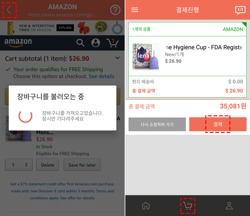 아마존 장바구니의 레나컵을 애프터바이 장바구니로 가져온 뒤 결제 클릭!