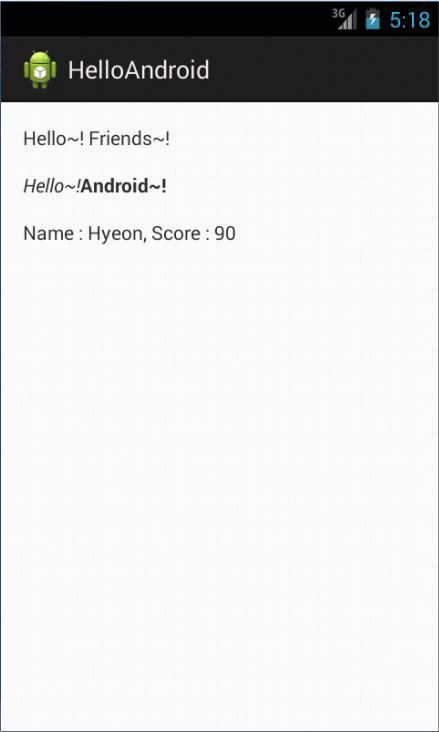 -> textView2 : <i>Hello~!</i><b>Android~!</b>, textView3 :Name : %1$s, Score : %2$d