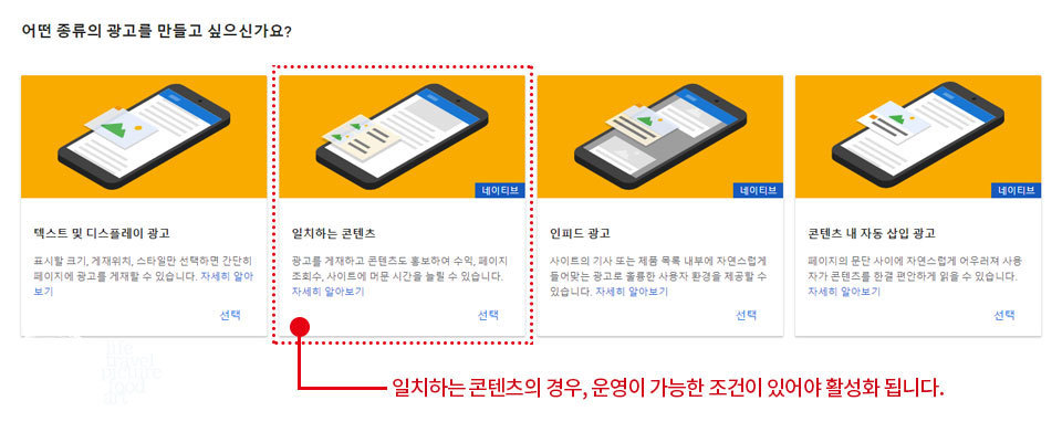 애드센스 광고의 종류 입니다. 하지만 처음 광고를 삽입해야 하는 블로거에게 안보이는 광고가 하나 있습니다. 아래 이미지에 네모박스 있는 일치하는 콘텐츠 광고입니다. 일치하는 콘텐츠 광고는 광고의 운영이 가능한 사이트 조건이 있습니다. 그부분은 아래 광고의 종류의 대해 설명할 때 적어보도록 하겠습니다.