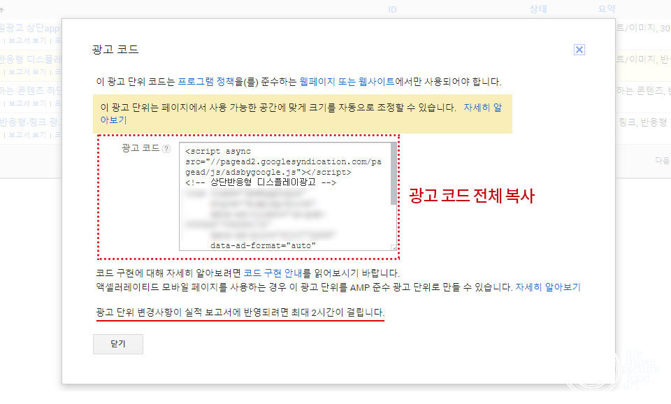 광고 코드가 생성이 되었다면 아래 코드를 전체 복사해줍니다. 복사한 광고 코드를 이제 티스토리 블로그에 적용시켜 보도록 하겠습니다.