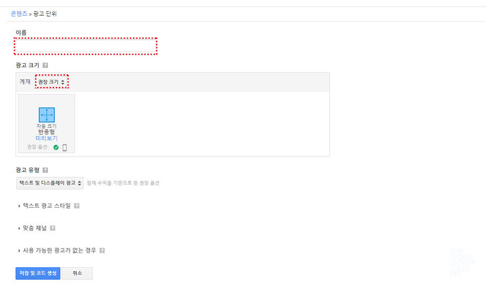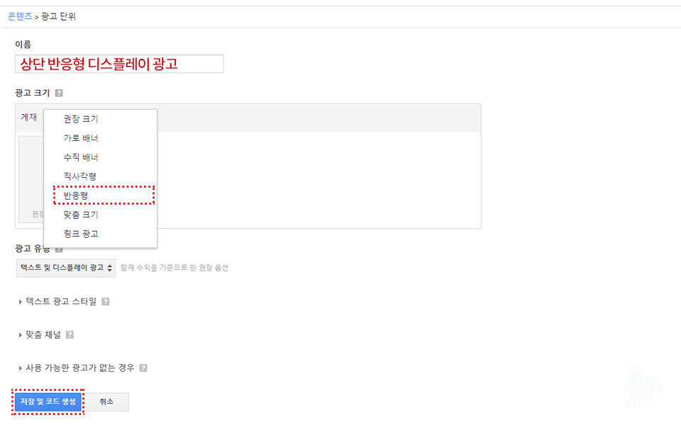 예를 들어 반응형 광고로 상단에 삽입할 예정이라면 광고의 이름을 (상단 반응형 디스플레이 광고) 하고 적어서 추후 광고 목록에서 본인이 보기 쉽게 적어두시면 좋습니다. 처음 광고를 달아야 할 때는 반응형으로 광고를 삽입하면 모바일용 광고를 만들지 않고 모바일에서도 광고가 최적화 되어서 잘보입니다. 아래 설정이 다 끝났다면 저장 및 코드 생성 버튼을 눌러줍니다.