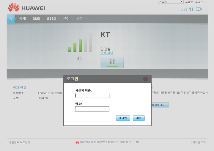 이동이 안될경우 192.168.8.1 로 접속하면 된다.