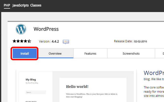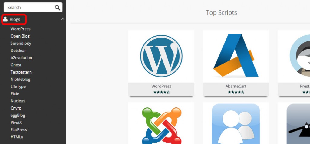 3. 왼쪽에서 블로그 하위 메뉴를 클릭 하고 원하는 스크립트를 선택하십시오.이 경우 WordPress 를 선택하겠습니다.