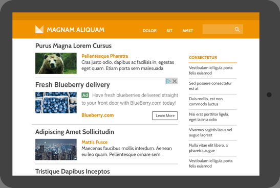 피드는 스트리밍 형태로 제공되고 스크롤해서 볼 수 있는 콘텐츠입니다. 피드에서는 콘텐츠가 비슷하게 생긴 블록의 집합처럼 표시됩니다. 피드의 종류로는 편집 피드(예: 기사나 뉴스 목록), 목록 피드(예: 상품, 서비스 등의 목록) 등이 있습니다. 피드는 페이지에서 어디에나 표시될 수 있습니다. 참고: 인피드 광고가 게재되는 피드는 RSS 같은 웹 배급 피드와 다르다는 점에 유의하세요.