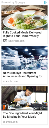 이 레이아웃에서는 이미지와 텍스트가 카드 안에 위아래로 나란히 표시됩니다. 이 레이아웃을 선택하려면 광고 코드에 data-matched-content-ui-type="image_card_stacked" 매개변수를 추가하세요.