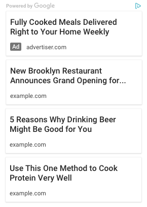 이 레이아웃에서는 카드 안에 이미지와 텍스트가 나란히 표시됩니다. 이 레이아웃을 선택하려면 광고 코드에 data-matched-content-ui-type="image_card_sidebyside" 매개변수를 추가하세요.