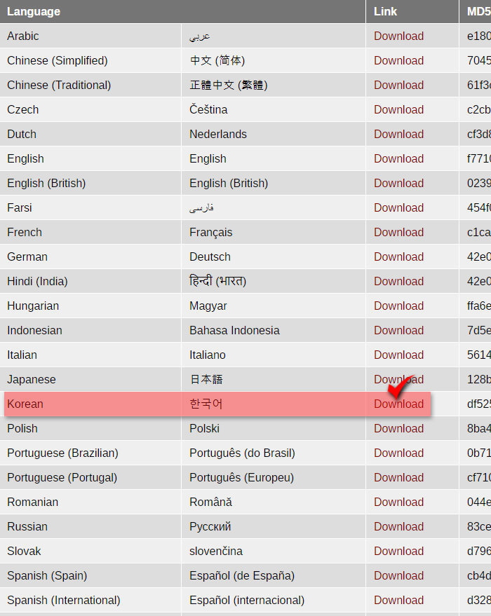 샷 하단에 링크될 다운로드 페이지에 접속해서 페이지 중간 쯤에 위치한 Language에서 한국어 Download 링크를 클릭하면 최신 버전의 파이어폭스 포터블을 내려받아 사용할 수 있습니다.