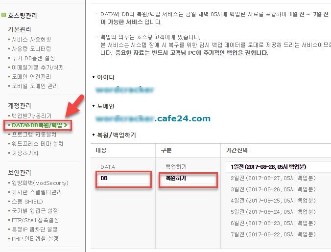 카페24에서 DB 복원하기