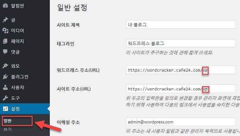 먼저 알림판의 설정 > 일반에서 사이트 주소를 루트로 변경합니다.