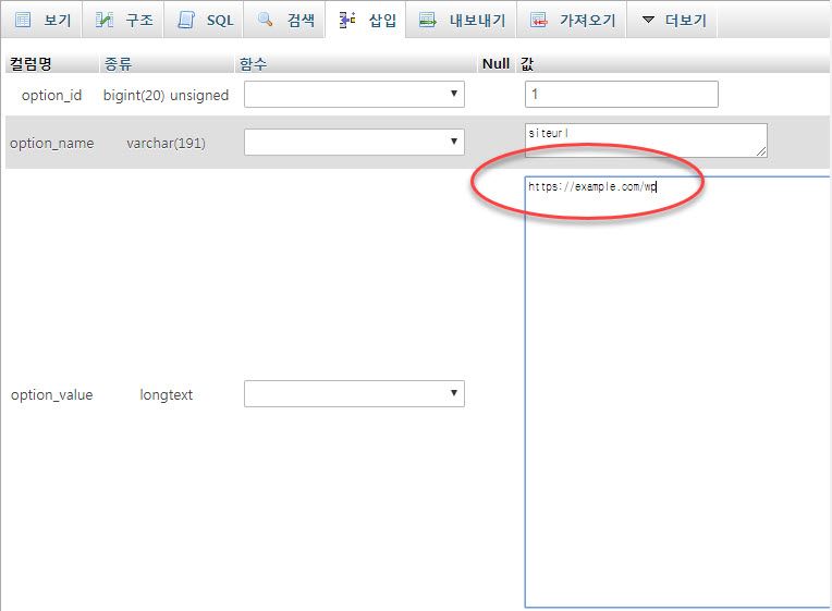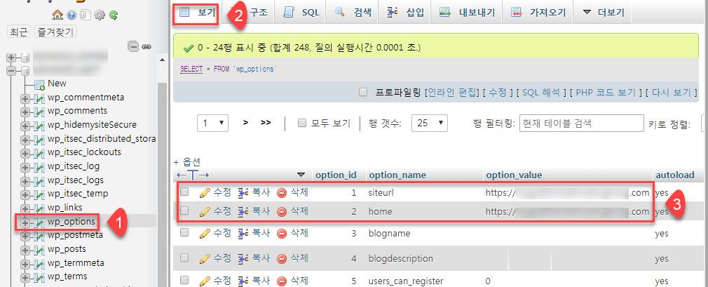 - (3) option_name에서 siteurl과 home 항목을 찾습니다.