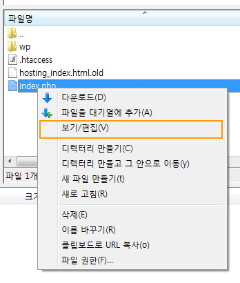 참고: 이 작업은 index.php 파일을 로컬 컴퓨터로 복사한 다음 컴퓨터에서 직접 수정한 후에 FTP를 통해 웹호스팅 서버로 올려도 상관 없습니다. /wp/... 부분은 해당 서브 폴더 이름에 따라 적절히 수정합니다. (예를 들어, /wordpress/ 하위 폴더에 워드프레스를 설치한 경우 /wp/를 /wordpress/로 변경하도록 합니다.)