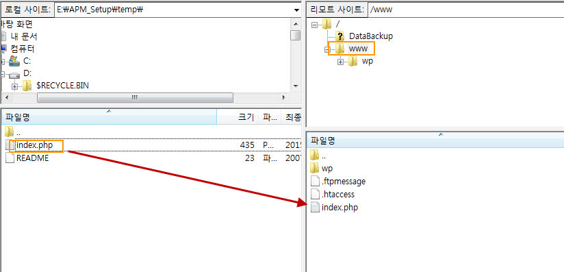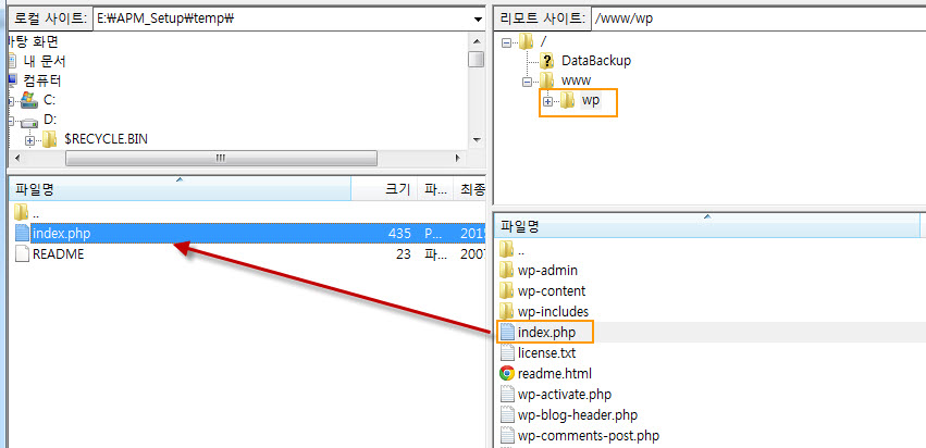 컴퓨터에 임시로 복사한 index.php 파일을 루트 디렉터리로 업로드합니다.