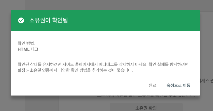 잠시 후 아래와 같이 소유권이 확인되면. 이제 기본적인 모든 절차는 완료되었습니다. Google 검색 로봇이 며칠 이내로 사이트를 수집하여 검색 결과에 반영하게 될 것입니다.