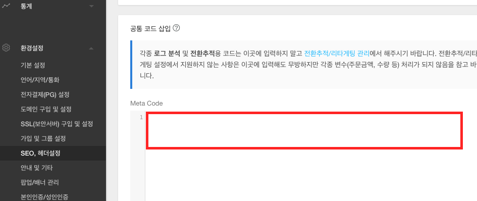 공통 코드 삽입 항목에서 Meta Code 에 위에서 복사한 HTML 태그를 붙여넣습니다.