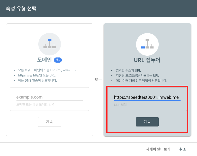 속성 유형 선택이 나타나면 URL 접두어 방식에서 내 사이트의 URL을 입력하고 계속을 누릅니다.