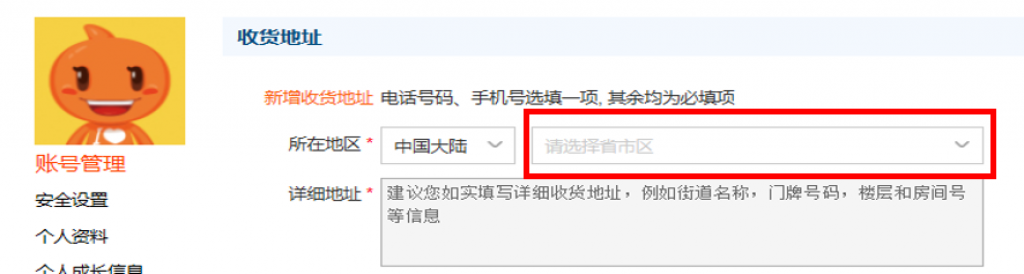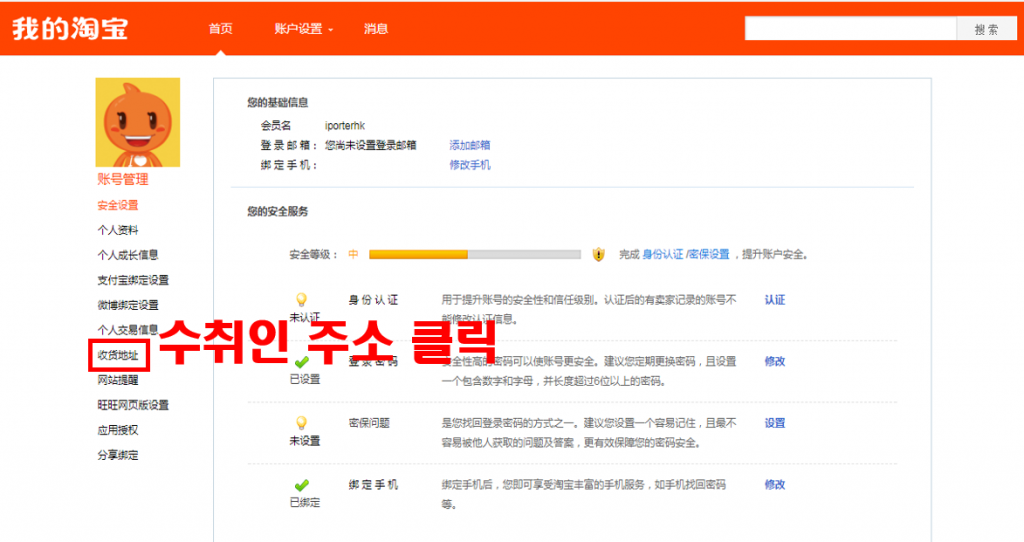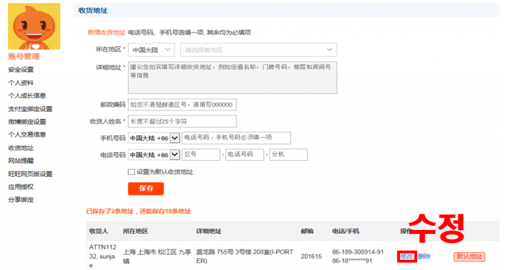 2. 계정 관리(账户管理) 에서 수취인 주소를 클릭해주세요