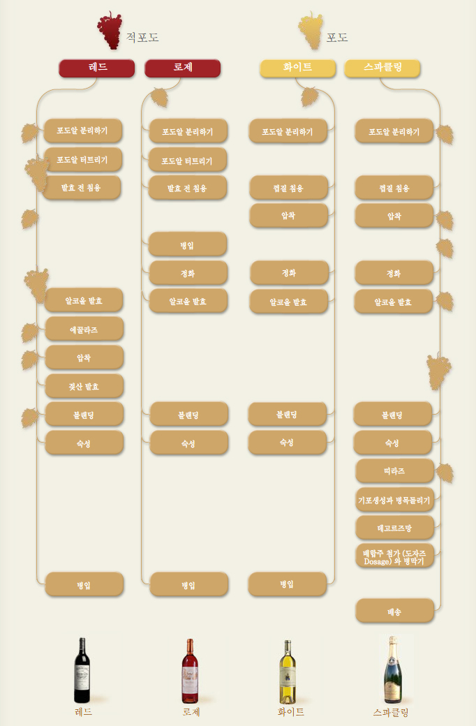 알코올 발효 알코올 발효는 효모의 작용을 통해 포도의 당분을 알코올로 변화시키는 과정이다. 효모는 포도의 껍질에 자연적으로 존재하는 물질로 레드와인의 경우 발효조 내부에서도 발견된다. 화인트와인의 경우는 압착을 하게되면 자연 효모가 제거되기 때문에 인공적으로 효모를 첨가시킨다. 알콜발효는 보통 5일동안 이루어지며 온도는 레드와인의 경우 28-32°C 사이에서, 화이트와인, 로제와인, 끌레레의 경우 섬세한 아로마를 잘 살려내기 위해 낮은 온도(18°C)에서 진행한다. 뻬싹레오냥, 그라브, 스위트화이트 같은 보르도의 고급 화이트와인의 경우 새 오크통에서 알코올 발효를 시키기도 한다.