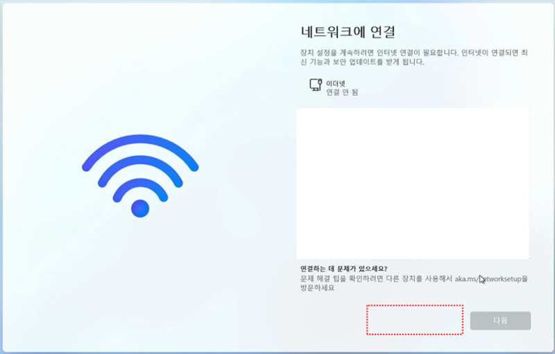 이와 같은 경우 유선랜 케이블(이더넷)을 연결하고 윈도우 설치를 진행해야 합니다.