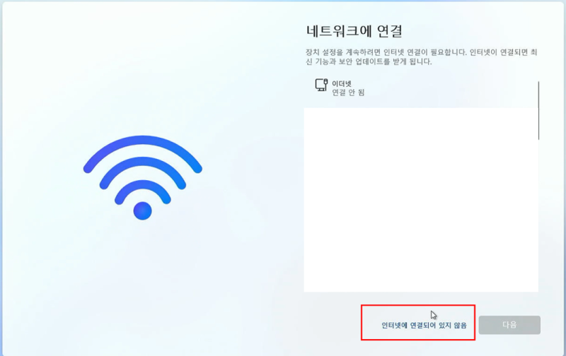기본 과정 진행 후 나타난 [네트워크에 연결] 화면에서는 처음과 다르게 [ 인터넷에 연결되어 있지 않음 ] 항목이 표시됩니다.