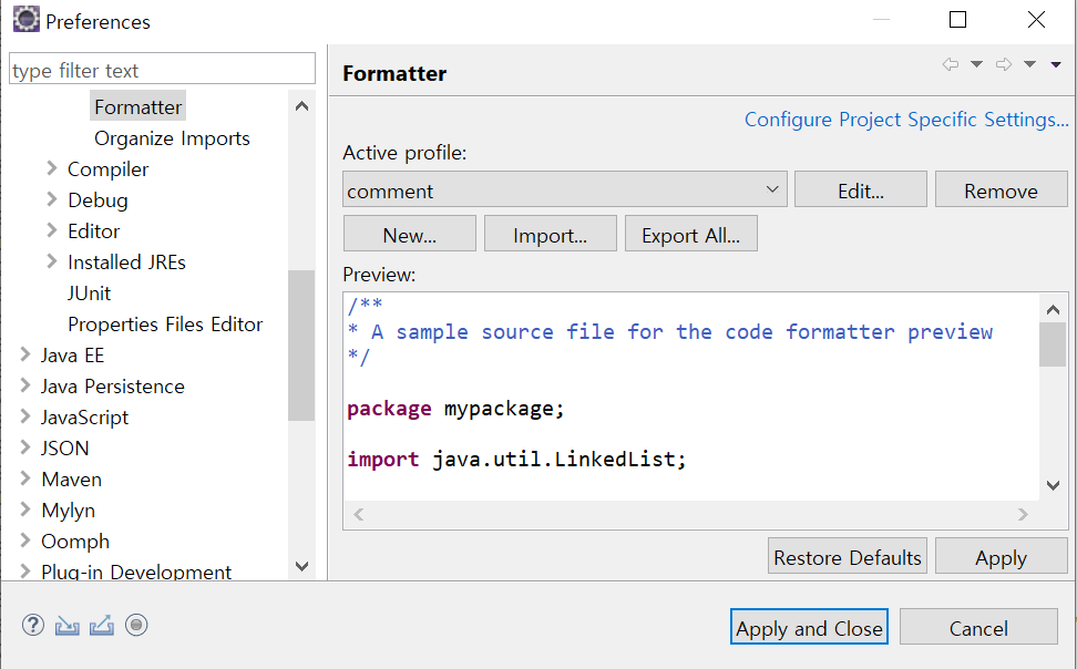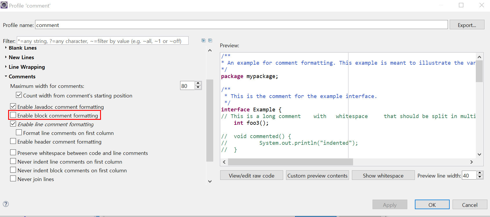 Enable block comment formatting 체크 해제 -> Apply and Close