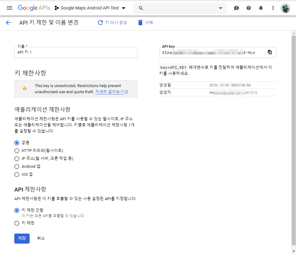9. 앞에서 생성된 API 키에 사용 제한을 둘 수 있는 웹페이지가 보입니다.