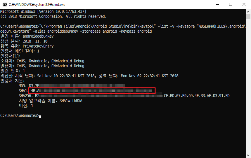 SHA1 옆에 있는 문자열을 복사해 놓으면 됩니다.