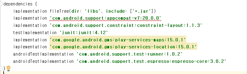 dependencies { implementation fileTree(dir: 'libs', include: ['*.jar']) implementation 'com.android.support:appcompat-v7:28.0.0' implementation 'com.android.support.constraint:constraint-layout:1.1.3' implementation 'com.google.android.gms:play-services-maps:15.0.1' implementation 'com.google.android.gms:play-services-location:15.0.1' testImplementation 'junit:junit:4.12' androidTestImplementation 'com.android.support.test:runner:1.0.2' androidTestImplementation 'com.android.support.test.espresso:espresso-core:3.0.2' } |