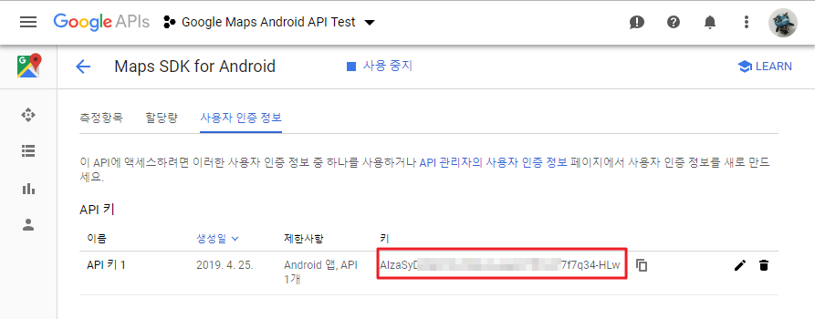 Google Maps Android API를 사용하려면 추가 설정이 필요합니다. API 및 사용 서비스 사용 설정을 클릭합니다.