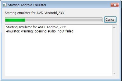 Starting Android Emulator 창에서 오류메시지가 뜨고 연두색 막대가 오른쪽 끝까지 가고나서