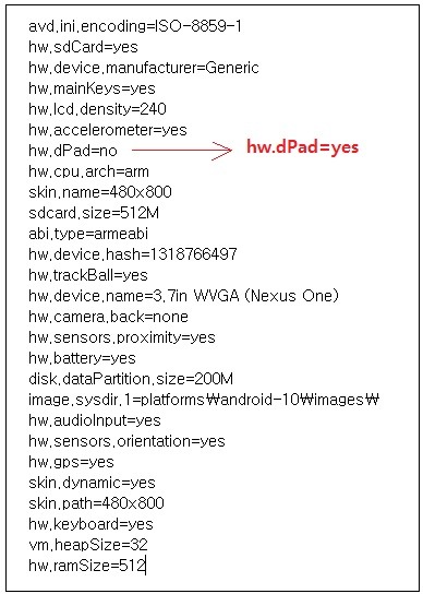 hw.dPad=no라고 있다면 hw.dPad=yes로 바꾸고